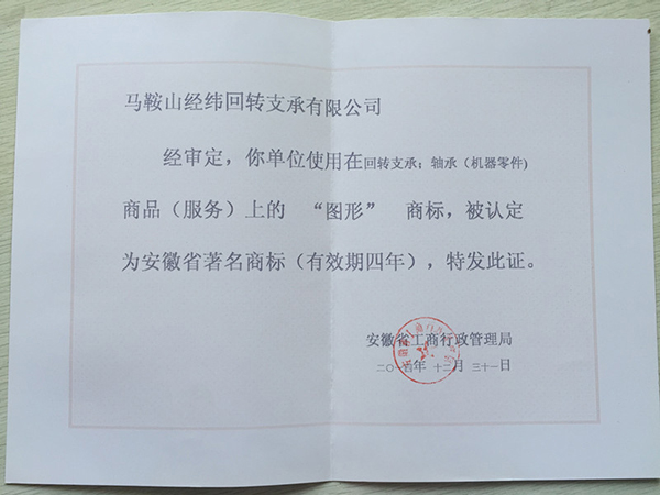 恭賀經(jīng)緯牌回轉(zhuǎn)支承被認(rèn)定為安徽省著名商標(biāo)