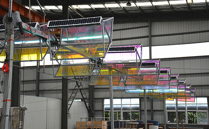 “農(nóng)光互補”新型“雙軸跟蹤光伏電站”是經(jīng)緯公司和中國科學技術(shù)大學響應國家新能源發(fā)展戰(zhàn)略而實施的眾多科研合作項目之一,由雙方共同設計建造。電站主要采用經(jīng)緯公司獨家生產(chǎn)的新一代“智能跟蹤支架”和中科大研制的聚光新材料“費聶爾”半鋼化覆膜曲面玻璃組裝而成,最大特點和優(yōu)勢就是不需大面積占地且能快速建站,在輸出清潔能源同時,對農(nóng)作物生長還可起到光照調(diào)節(jié)作用。2017年初,經(jīng)緯、中科大合作創(chuàng)建“產(chǎn)學研合作基地”和“光熱光伏領(lǐng)域聯(lián)合創(chuàng)新中心”,開發(fā)項目就包括建立新型光伏農(nóng)業(yè)示范基地。為實現(xiàn)這一既定目標,雙方各施所長,經(jīng)緯公司推出的合作強項除先進的數(shù)控生產(chǎn)能力、專業(yè)的科研團隊外,還有具備核心競爭力和完全自主知識產(chǎn)權(quán)的光伏跟蹤系列產(chǎn)品,其中被專業(yè)人士和主流媒體評價具有“顛覆性”的“經(jīng)緯智能跟蹤系列支架”成為最大亮點,因為它有反應速度快、重量輕、避風性強、安裝便捷、網(wǎng)架與動力系統(tǒng)分離等超越同類的顯著優(yōu)勢,適合樓面、彩鋼瓦屋面、陸地等全地形匹配,應用范圍廣泛,因此不僅受到國內(nèi)外客戶高度認可,也深深打動了見多識廣的中科大光伏專家們,激發(fā)起他們強烈的合作欲望和獨特的創(chuàng)新靈感,從而誕生了現(xiàn)在這座設計和應用上獨一無二的新型光伏電站。