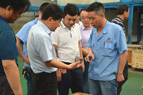 在經(jīng)緯公司總經(jīng)理?xiàng)钍篮昱阃?,闕縣長(zhǎng)深入生產(chǎn)車(chē)間,一邊仔細(xì)察看生產(chǎn)布局,一邊詳細(xì)詢(xún)問(wèn)產(chǎn)品和銷(xiāo)售情況。在回轉(zhuǎn)支承車(chē)間,闕縣長(zhǎng)仔細(xì)聽(tīng)取了經(jīng)緯公司和“三一”重工、“中聯(lián)”重工等大型企業(yè)合作情況的介紹;在高精度齒輪生產(chǎn)車(chē)間,闕縣長(zhǎng)饒有興趣地拿起一旁的行星減速機(jī)配件,深入了解其用途;在安裝了經(jīng)緯公司生產(chǎn)的“跟蹤回轉(zhuǎn)減速機(jī)”的小型太陽(yáng)能電站旁,闕縣長(zhǎng)還詳細(xì)詢(xún)問(wèn)了該產(chǎn)品的作用和性能,以及在光伏光熱市場(chǎng)中的應(yīng)用情況。