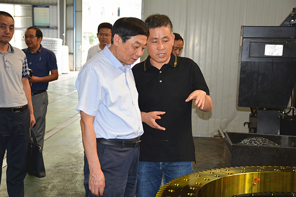在經(jīng)緯公司總經(jīng)理楊世宏陪同下,魏主任首先步入生產(chǎn)車間,先后察看了回轉(zhuǎn)支承加工和裝配現(xiàn)場,同時不忘詢問企業(yè)產(chǎn)品結(jié)構(gòu)、市場開發(fā)、員工收入以及科技創(chuàng)新等詳細(xì)情況,楊世宏總經(jīng)理一一作答。當(dāng)聽到經(jīng)緯公司正在為“三一重工”、“中聯(lián)重工”等著名企業(yè)提供配套產(chǎn)品;同時還建有全省獨(dú)一無二的“蝸輪驅(qū)動工程技術(shù)研究中心”;員工收入在經(jīng)開區(qū)企業(yè)中位列中上等;參與建設(shè)的內(nèi)蒙古達(dá)拉特旗光伏“駿馬”電站近期入選世界吉尼斯紀(jì)錄,成為世界上最大的光伏板圖形電站等一些具有代表性的成就時,魏主任高興地稱贊到:沒想到經(jīng)緯公司做得這么好。