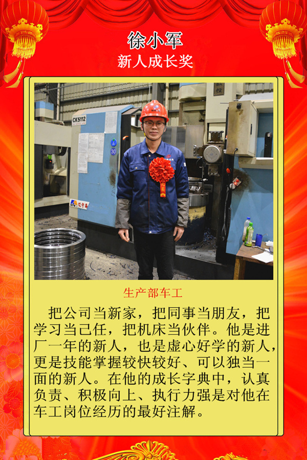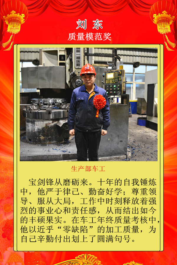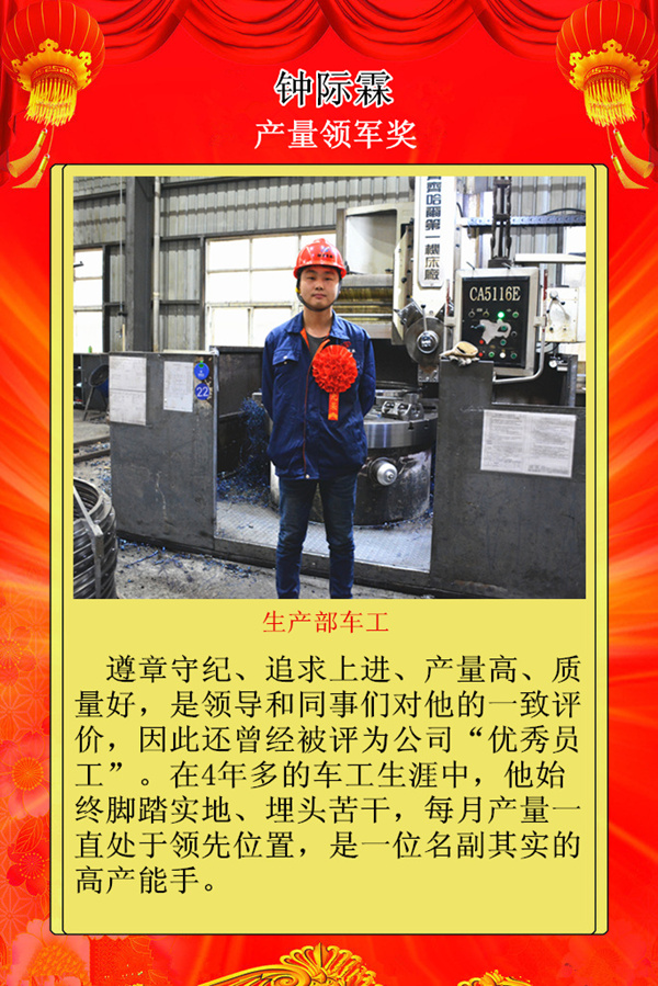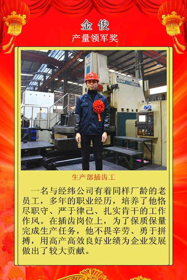 經(jīng)緯公司2019年度首屆新設(shè)優(yōu)秀獎(jiǎng)項(xiàng)評(píng)比日前揭曉,來(lái)自生產(chǎn)、品質(zhì)、驅(qū)動(dòng)、設(shè)備保障以及銷售等部門的13名個(gè)人和1個(gè)班組分別摘得“產(chǎn)量領(lǐng)軍獎(jiǎng)”、“質(zhì)量模范獎(jiǎng)”、“忠誠(chéng)奉獻(xiàn)獎(jiǎng)”、“節(jié)約先鋒獎(jiǎng)”、“特殊貢獻(xiàn)獎(jiǎng)”、“突擊勇為獎(jiǎng)”、“新人成長(zhǎng)獎(jiǎng)”和“班組和諧獎(jiǎng)”八大獎(jiǎng)項(xiàng),他(她)們?cè)诠?020年會(huì)盛典上受到隆重表彰。這些獲獎(jiǎng)人員分別是: