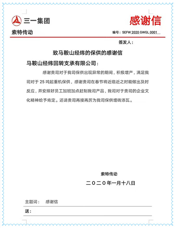 日前,一封滿帶信任與鼓勵的感謝信飛到經(jīng)緯公司,它來自“三一”集團索特傳動設備有限公司。信中,索特公司對“經(jīng)緯”在春節(jié)臨近期間為保供做出的努力和成就表示感謝,并對“經(jīng)緯”企業(yè)文化精神給予充分肯定,字里行間無不流露著真情實感。