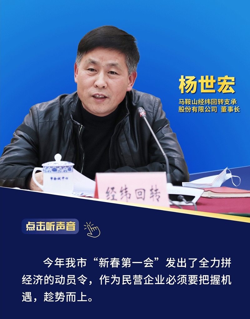 一年春作首,萬(wàn)事行為先。2月16日,備受社會(huì)關(guān)注的馬鞍山市民營(yíng)企業(yè)家座談會(huì)如約舉行。應(yīng)市委、市政府邀請(qǐng),來(lái)自本市民營(yíng)企業(yè)的12位企業(yè)家齊聚“采石會(huì)客廳”,和市委書記一道,共話發(fā)展,共謀未來(lái)。經(jīng)緯回轉(zhuǎn)支承股份有限公司董事長(zhǎng)、總經(jīng)理?xiàng)钍篮陸?yīng)邀出席座談會(huì)。
