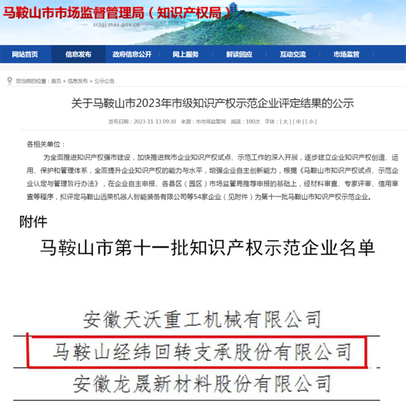 日前,馬鞍山知識(shí)產(chǎn)權(quán)局公布2023年市級(jí)知識(shí)產(chǎn)權(quán)示范企業(yè),馬鞍山經(jīng)緯回轉(zhuǎn)支承股份有限公司獲評(píng)上榜。這是對(duì)經(jīng)緯公司知識(shí)產(chǎn)權(quán)管理水平的權(quán)威認(rèn)可,也再次彰顯了經(jīng)緯公司綜合實(shí)力和核心競(jìng)爭(zhēng)力。