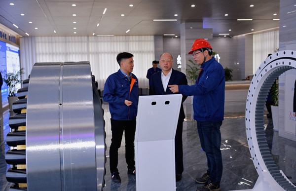 隨后,鄒致師一行又來到經(jīng)緯形象展廳,駐足產(chǎn)品實(shí)物前,認(rèn)真聽取楊世宏總經(jīng)理介紹經(jīng)緯光伏驅(qū)動、風(fēng)電主軸軸承、偏航、變槳軸承等系列產(chǎn)品制造工藝和場景應(yīng)用,對經(jīng)緯在立志實(shí)現(xiàn)國產(chǎn)替代進(jìn)口和科技自立自強(qiáng)等方面所展現(xiàn)出的創(chuàng)新勇氣及創(chuàng)新成就表示由衷贊許。