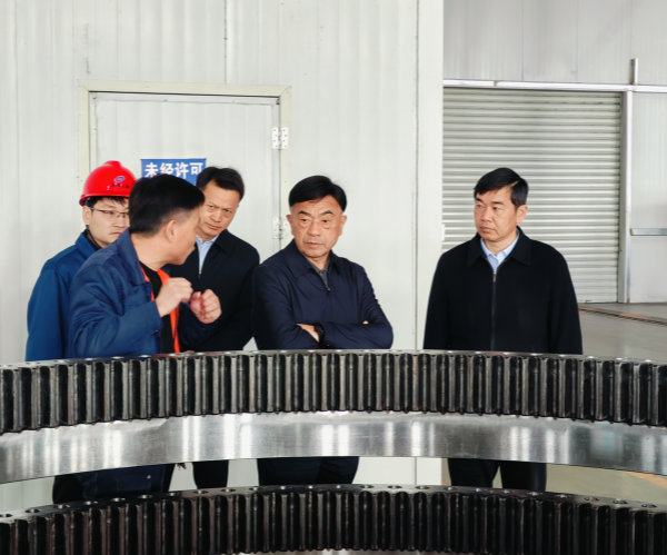 【圖為丁毅(前排左二)參觀經(jīng)緯風(fēng)電變槳軸承產(chǎn)品】