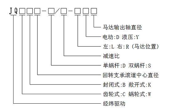 如:JQCB525-D/125-RD25 即:經(jīng)緯齒輪式封閉型回轉減速機,回轉支承滾道中心直徑為525mm,單蝸桿驅(qū)動,其傳動比為1:125,電動馬達位置在右側,輸出軸直徑為25mm。
